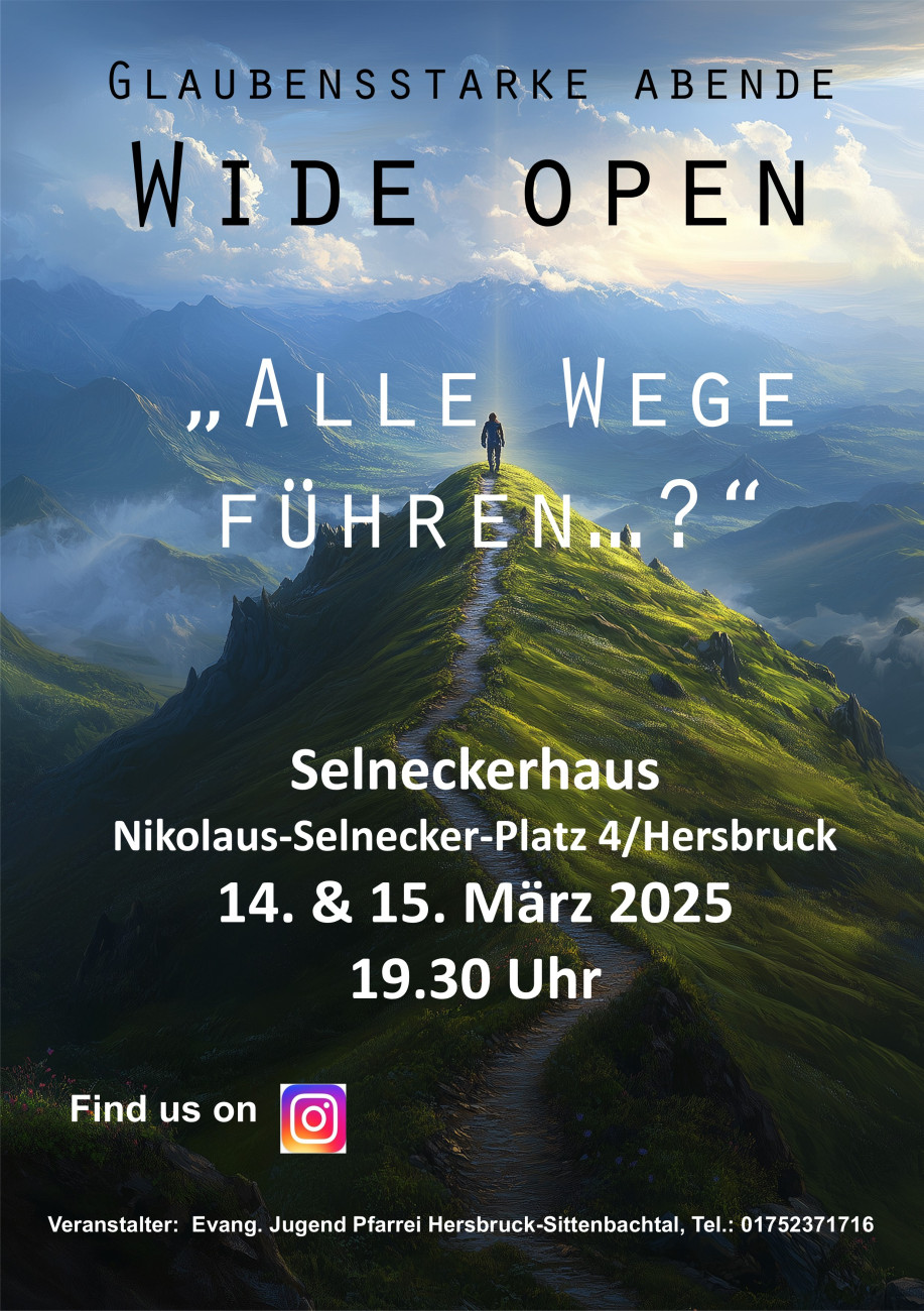 Am Freitag, den 14. und Samstag, den 15. März öffnen sich um 19.00 Uhr die Türen zu den Jugendräumen der Evang. Jugend im Selneckerhaus in Hersbruck, Nikolaus-Selnecker-Platz 6, zu den Glaubensstarken Abende „wide open“.